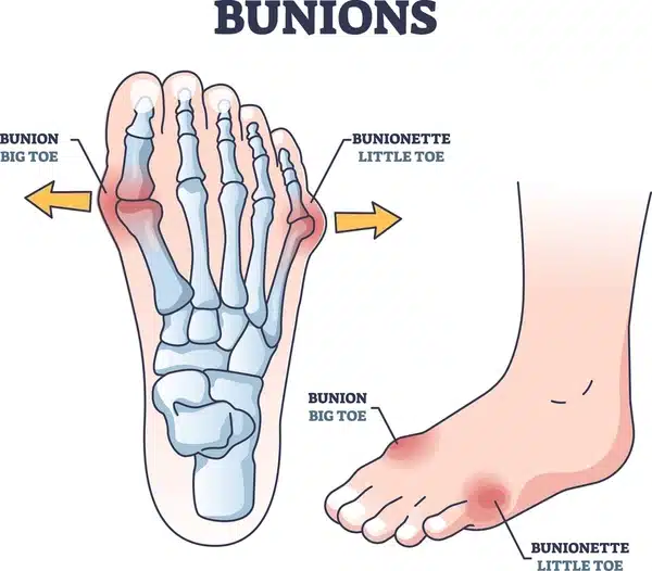 Bunions are an extremely common condition. So much so that nearly 1 in 3 Americans have at least one type of bunion. Standard hallux valgus bunions develop on your big toe from long term pressure. Bunionettes, or Tailor’s bunions, form on your pinky toe rather than the big toe. They’re usually caused because your shoes don’t fit right or you’re doing something that presses your little toe into your other toes.