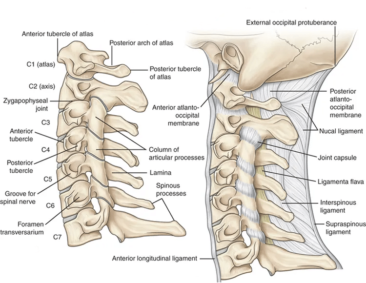 Remember, you’ve got 33 vertebrae in your spine, all held together by ligaments. When it comes to your neck, there are 5 main ligaments: anterior longitudinal ligament (ALL), posterior longitudinal ligament (PLL), supraspinous ligament, interspinous ligament, and the ligamentum flavum. If one (or more) of these ligaments gets injured, then even the tiniest movements like turning your head can become super painful.