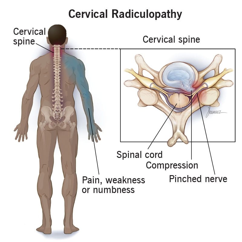 If you’re under 50, it’s usually due to a herniated or bulging disc in your neck. That’s when the outer layer of your disc starts to weaken and eventually cracks. Once that happens, the jelly material inside your disc can “leak” out and press against your nerve, causing those classic radiculopathy symptoms.