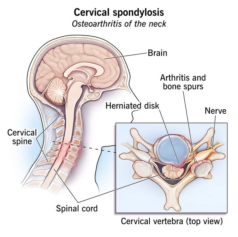 This last injury, called cervical spondylosis, is what happens when years of wear and tear finally catch up with your neck. Think about it, your neck has a ton of responsibilities and rarely gets a break. It holds your head up, lets you turn and look around, and supports almost every movement you make on a daily basis. Over time, all that work really takes a toll. And eventually, that toll comes in the form of cervical spondylosis.