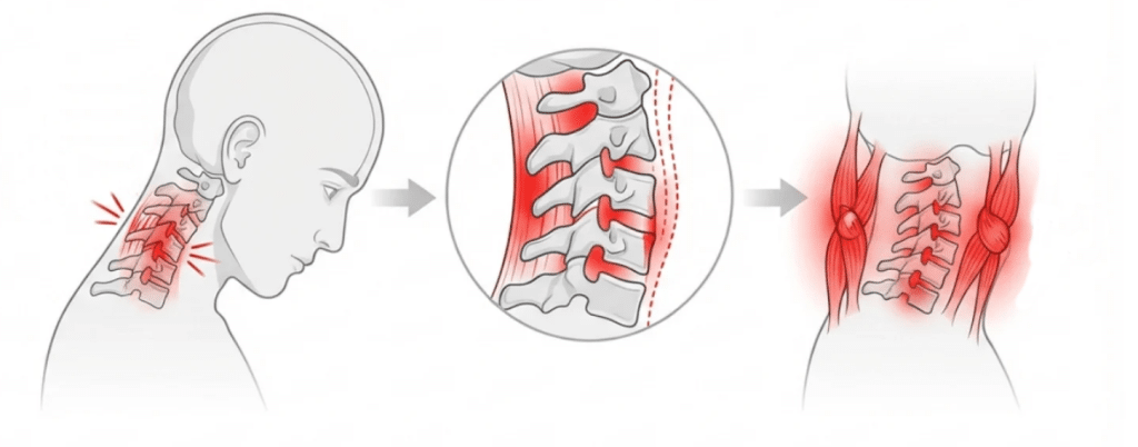 In most cases, the pain shows up right near the irritated joint. But your neck doesn’t work alone, it’s connected to your shoulders, upper back, and arms, so that pain can easily spread. You might also notice muscle spasms or some tingling “pins and needles” type sensation as well.