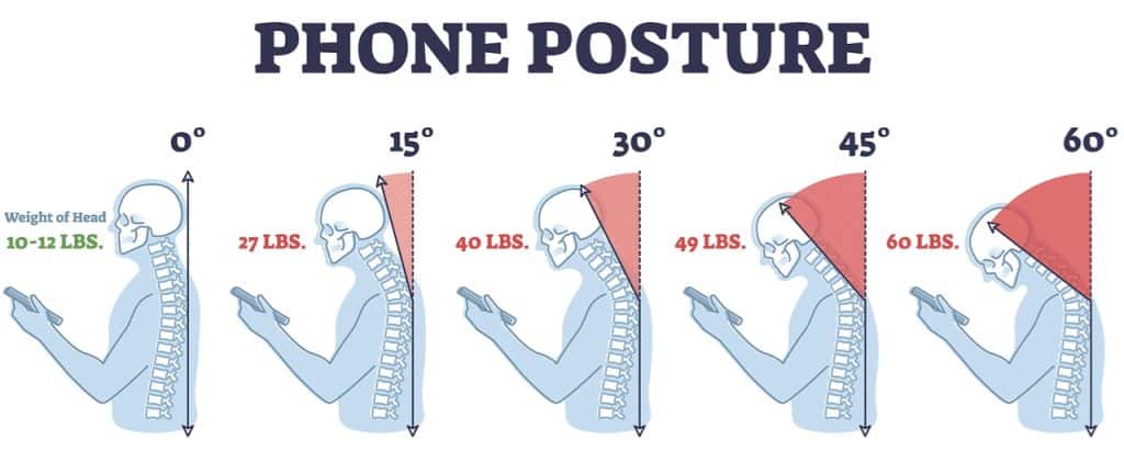 Now, here’s the real eye opening part. The more your head tips forward, the heavier it feels to your neck. At just a 15° tilt, you’re adding 27lbs of force! A 30° tilt jumps to 40lbs of pressure, and 60° adds an extra 20lbs, putting you at a whopping 60lbs of force! That’s like carrying an 8 year old child on your neck all day.